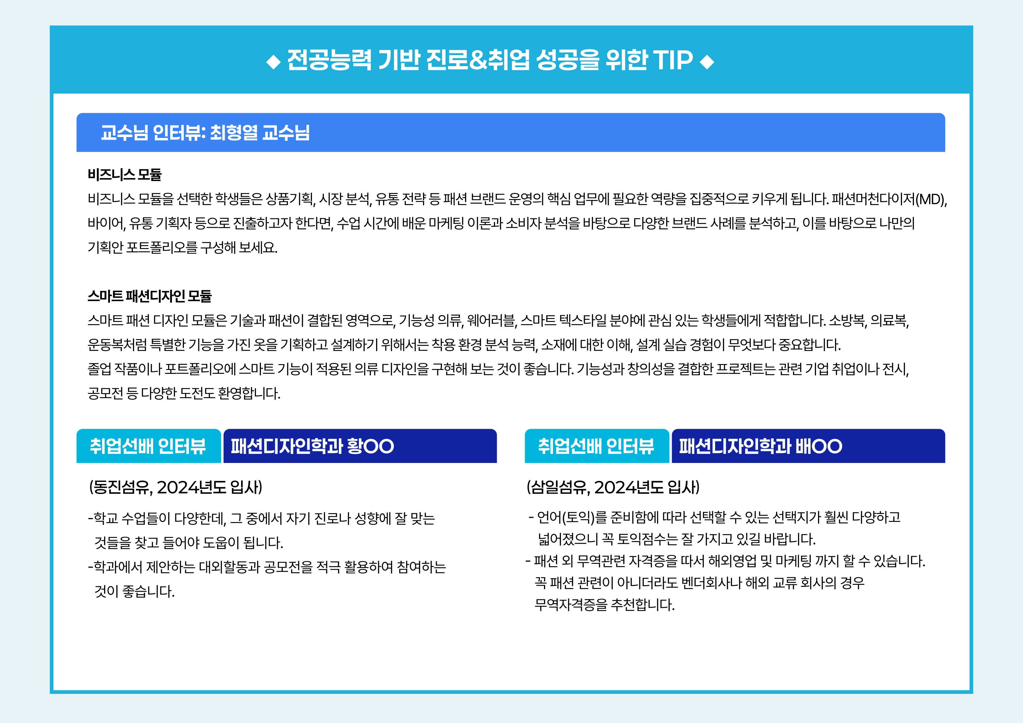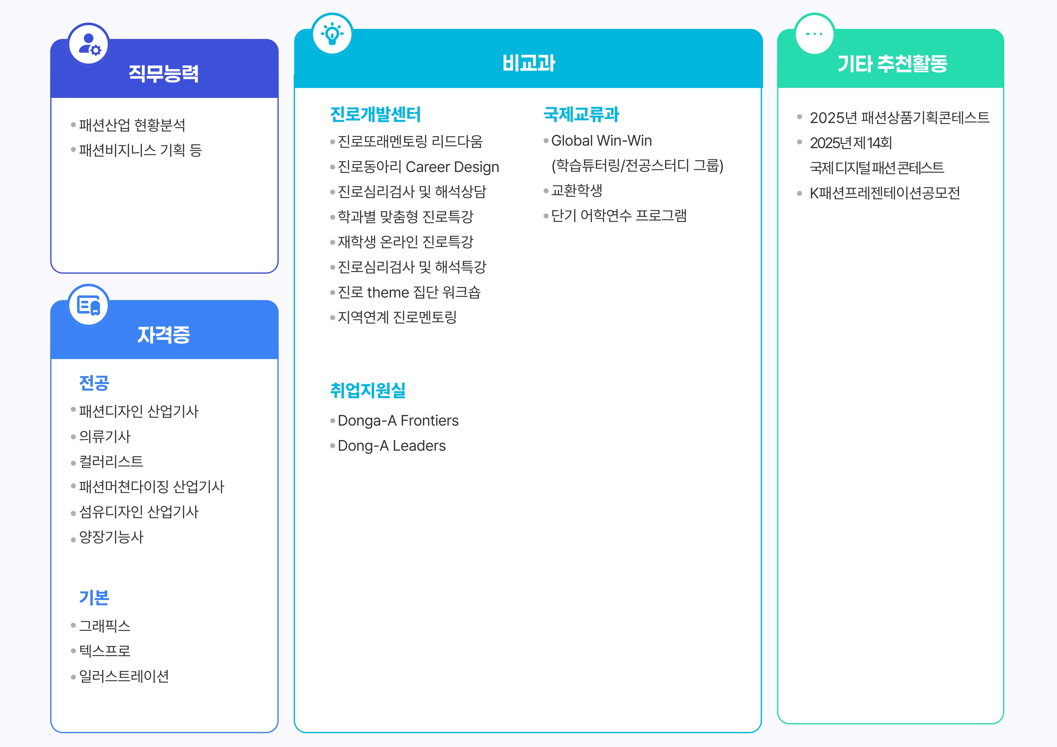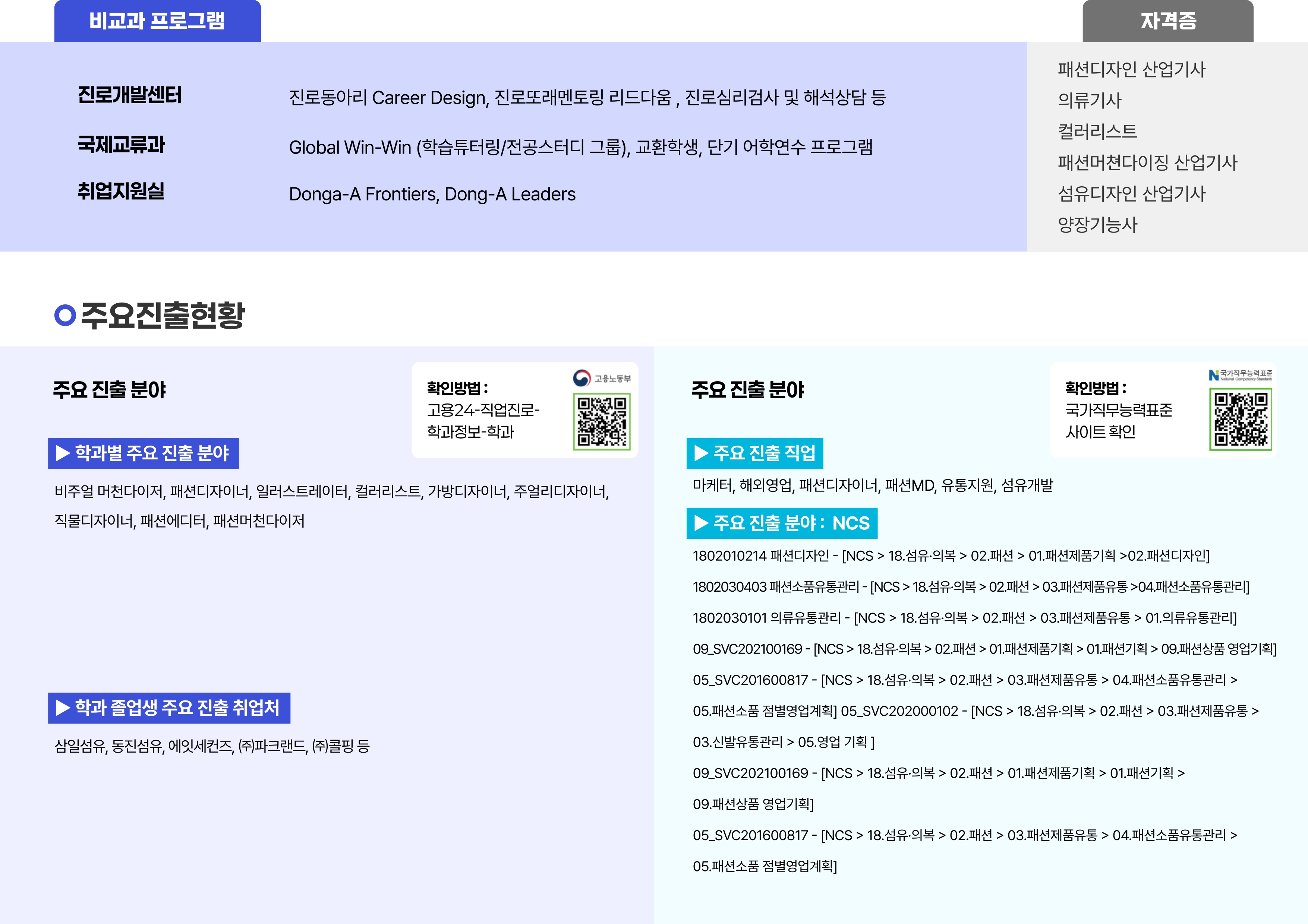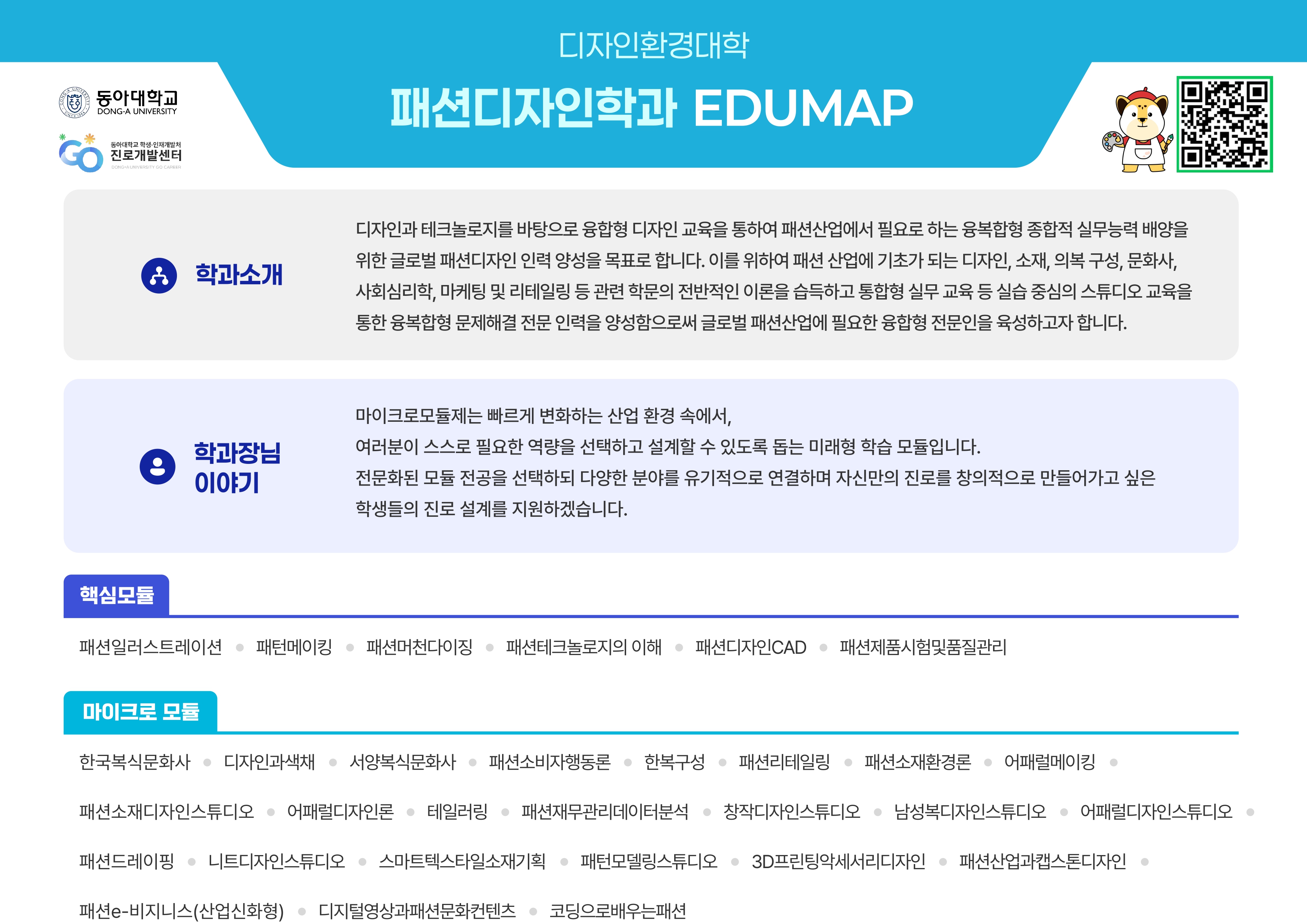학과소개 열린 미래 꿈이있는 대학, 동아대학교 메인으로 이동 학과소개 학과소개 교수진 학부 대학원 취업광장 동아패션뉴스 졸업작품발표회 닫기 졸업 후 진로소개 학과연혁 교육목표 발전계획 및 특성화 취득가능 자격증 졸업 후 진로소개 오시는길 입학안내 닫기 학과소개 학과소개 학과연혁 교육목표 발전계획 및 특성화 취득가능 자격증 졸업 후 진로소개 오시는길 입학안내 입시전형 졸업 후 진로소개 SNS 목록열기 FACEBOOK 공유하기 TWITTER 공유하기 BLOG 공유하기 SNS 목록닫기 인쇄 url 복사