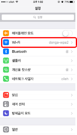 1. 메인화면에서 설정을 터치합니다. <그림1>과 같이 설정에서 Wi-Fi를 선택합니다.